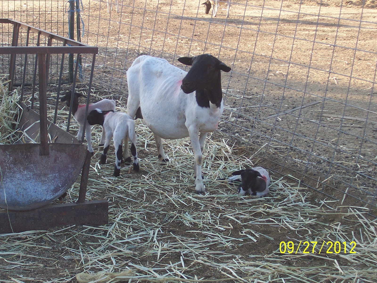 It's that time again, set of Dorper Triplets this morning, several more ewes due soon so I got out the marking paint and tagged these three. They are much easier to mark on the first day, by second or third day they do a good job of either out running me or zig zagging making them hard to catch. Also I mark the ewe first, it is easier to match the lambs to the ewe that way. Some hear the pffffffft from the spray can and end up with racing stripes, so babies get matching stripes if that's the case. These are one ram and two ewe lambs.